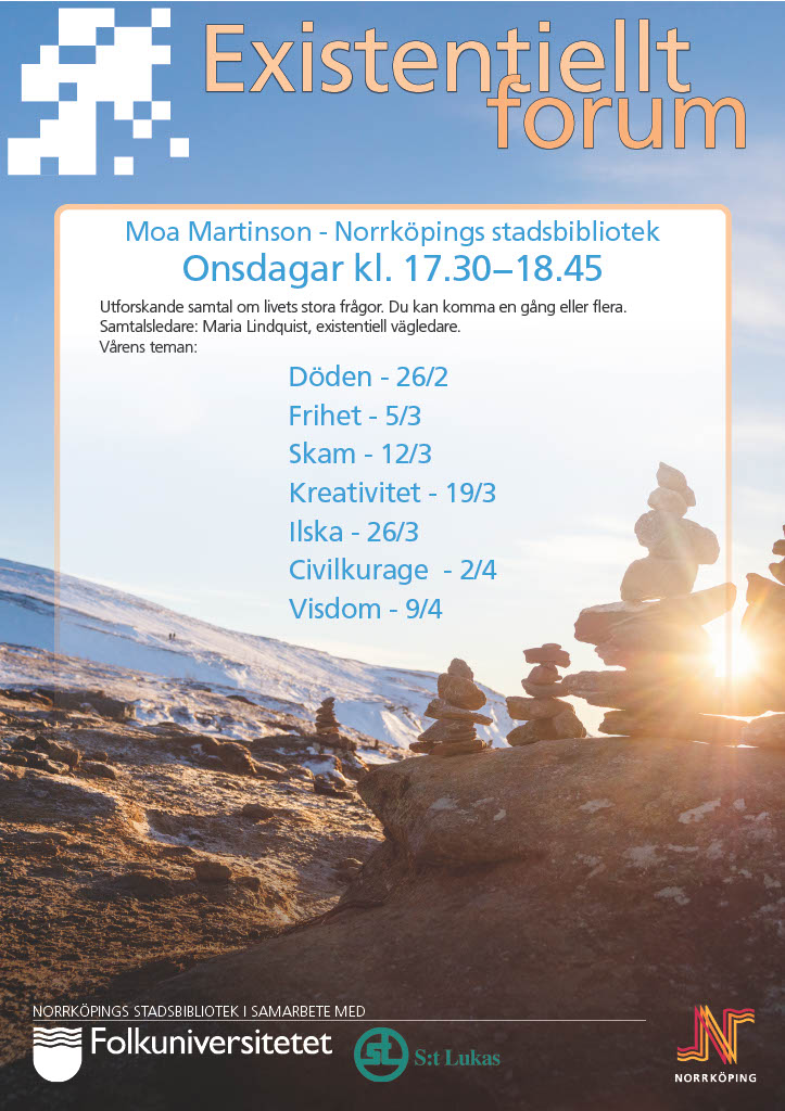 Utforskande samtal om livets stora frågor. Gruppen är öppen och kostnadsfri och du kan komma en gång eller flera.Samtalsledare: Maria Lindquist, existentiell vägledare.